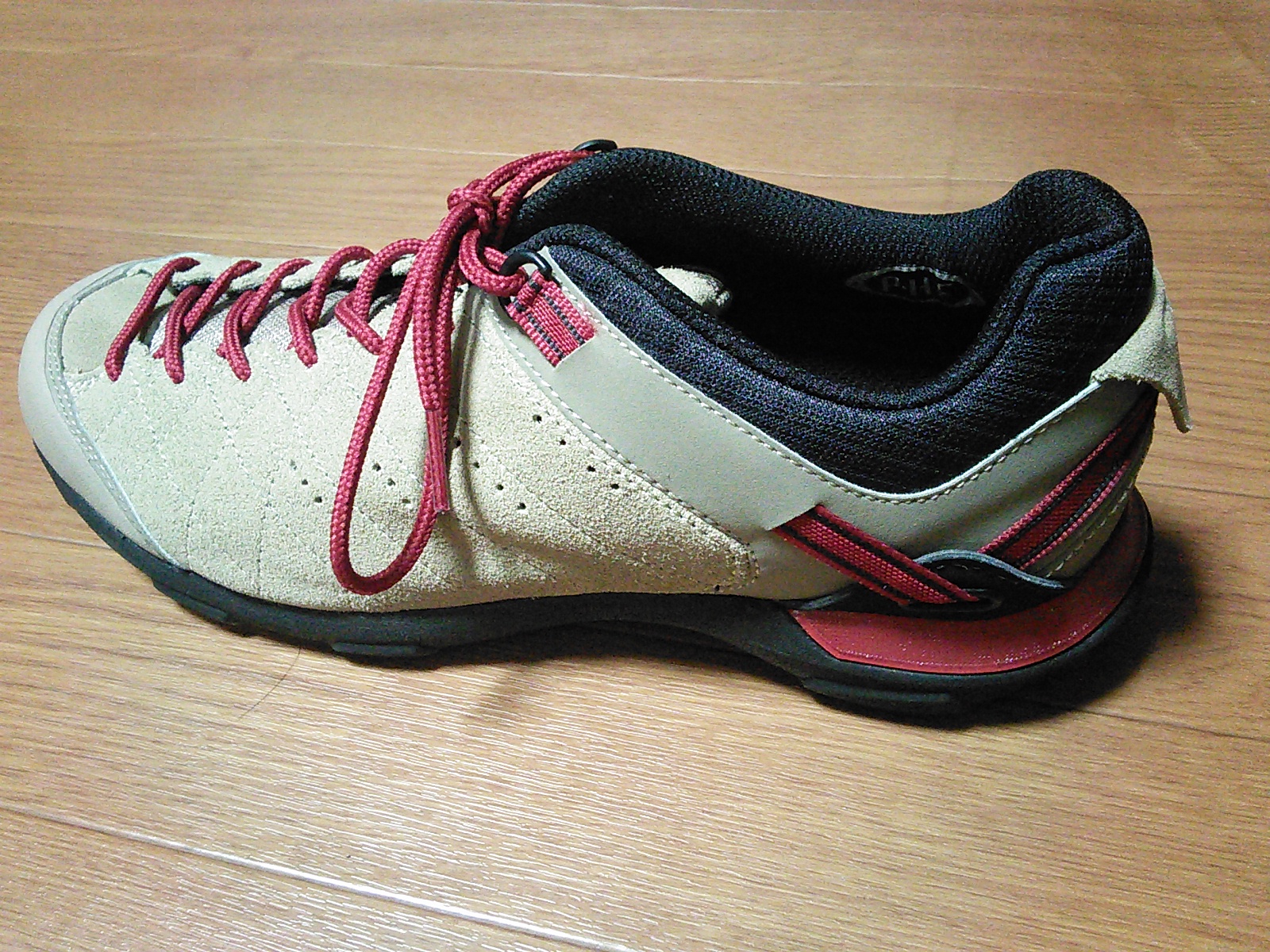 アシックス「Fieldwalker601」 道具 2015年07月18日 0 ジャンルとしてはウォーキングシューズになると思いますが、山歩きに使っています。日帰りハイキングなら十分でしょう。舗装路歩きにもいいですし。重さは、片足で325gちょっと。防水性はないのでGranger'sの撥水剤を使っていますが、濡れた状態が続いたら流石に浸水は免れないでしょう。ローカットなので、靴の中に異物が入るのを防ぐのにはゲイターがいいでしょう。取りあえず、モンベルのストレッチスパッツを使ってみて実用上問題はないのですが、使い勝手のいいものを他に探してみようと思っています。靴紐が、踵の後ろに回した帯のような形状のコードを引き締める構造になっていて、長い下り坂で靴の中で足が前にズレて、爪先が中で当たるのを防ぐようになっています。オブリーク・ラストを採用しているので、足指が窮屈な感じもありません。 [0回]