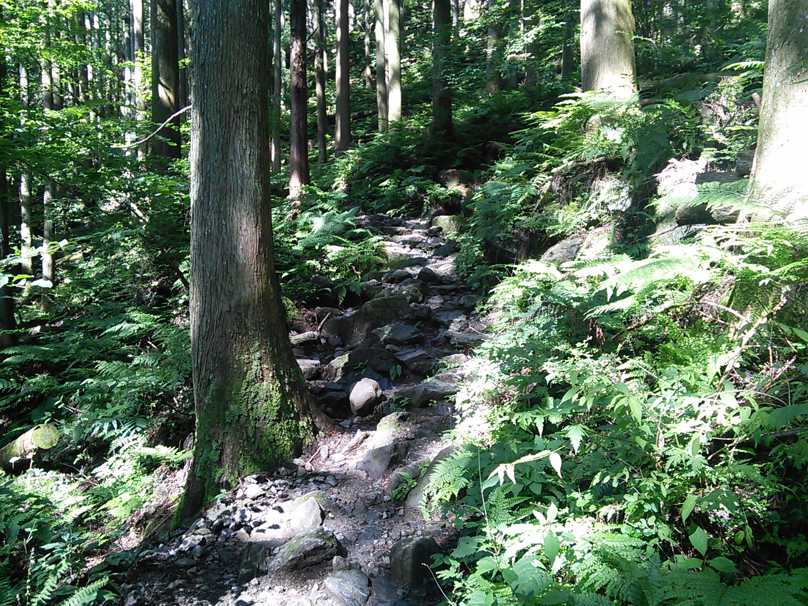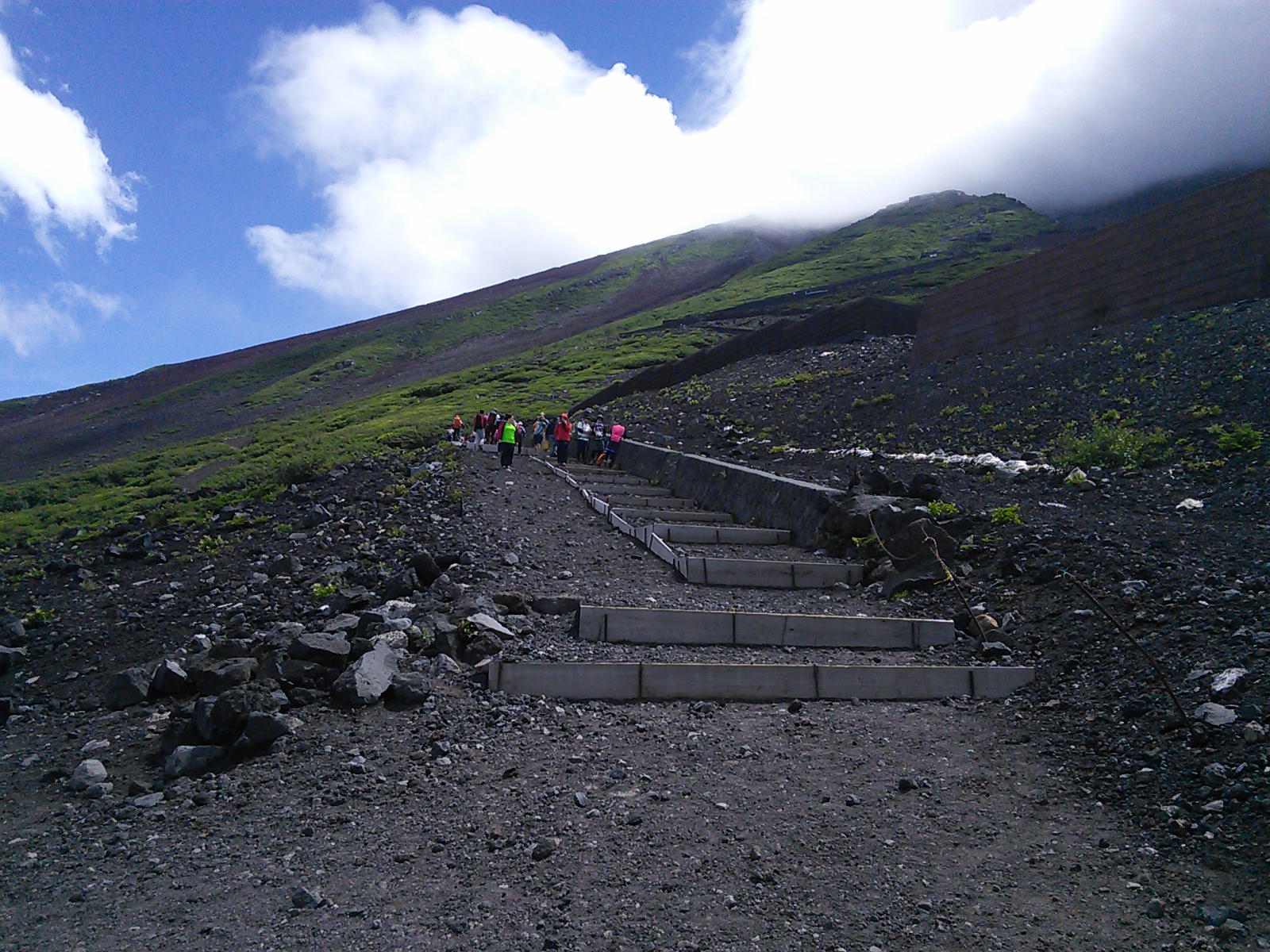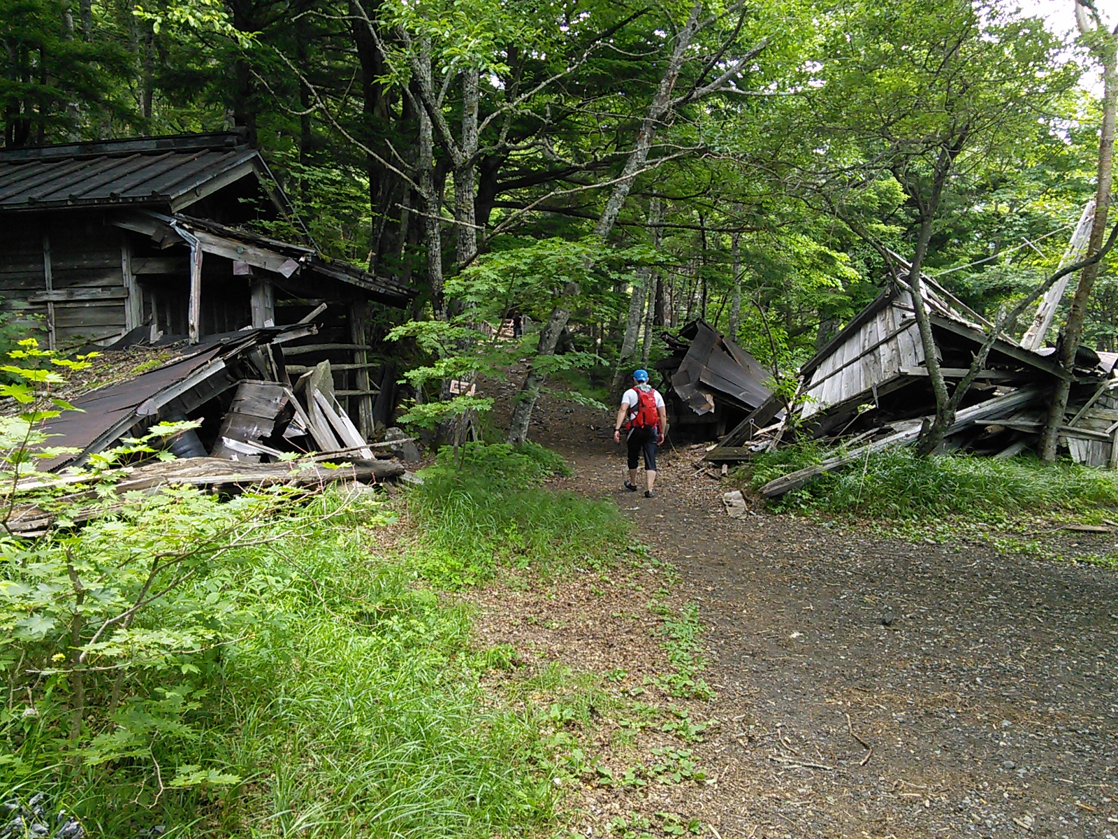 2015年7月19日 吉田口遊歩道・富士山六合目 富士山・御坂・愛鷹 2015年07月21日 0 富士山の六合目まで登ってきました。 まず富士山駅近くの北口本宮冨士浅間神社にお参りします。 浅間神社の近くから馬返しまで、吉田口遊歩道を歩いていきます。この辺りは今から400年ほど前の寛永年間に赤松が植林されたということで、今でも赤松の多い森になっています。富士山という火山の麓には、痩せた土地に強い赤松が合っていたのでしょうか。 びっくりするほど真っ直ぐ続く道で、富士山の裾野の広さを実感します。暑いことは暑いのですが、樹の陰を歩いていくのでそれほど辛くはありません。もう少し涼しい季節に歩いたら最高でしょう。あまり歩いている人はいないのですが、隣に並行して一般道があるので車の音は始終聞こえます。 何度か車道を横切って遊歩道を進むと、馬返しに着きました。ここから富士登山の本番、と言ったところでしょうか。 馬返しから一合目まではすぐです。トレイルランナーが多いですね。 立派な針葉樹の森になっています。コメツガ、シラビソ、カラマツなどが生えています。亜高山帯、でいいのかな?このあたりはもう、かなり涼しくなっています。 二合目。今は廃屋になった御室浅間神社があります。 三合目の廃屋。 見晴らしもあります。 いつの間にか背の低い木ばかりになってきたと思っていると、佐藤小屋に着きました。高木がないので、風景がすっかり変わります。朝に下から富士山を見たときは、頂上が笠のような雲に覆われていましたが、ここから見上げても頂上の方は雲がかかっています。 もう少し登っていくと、六角堂が見えてきました。 六合目の安全指導センター付近にて。 六合目付近で、富士スバルラインから登ってくるルートと合流しています。海外から来たらしき人も多いですね。今日は頂上には行かないので、富士スバルライン五合目に向けて下っていきます。 ハイシーズンということで、富士スバルライン五合目は多くの人で賑わっていました。小御嶽神社にお参りして、今日の山歩きは終了です。山頂を踏むのはまたの機会にします。2015年8月12日〜13日 富士山(吉田ルート) [0回]