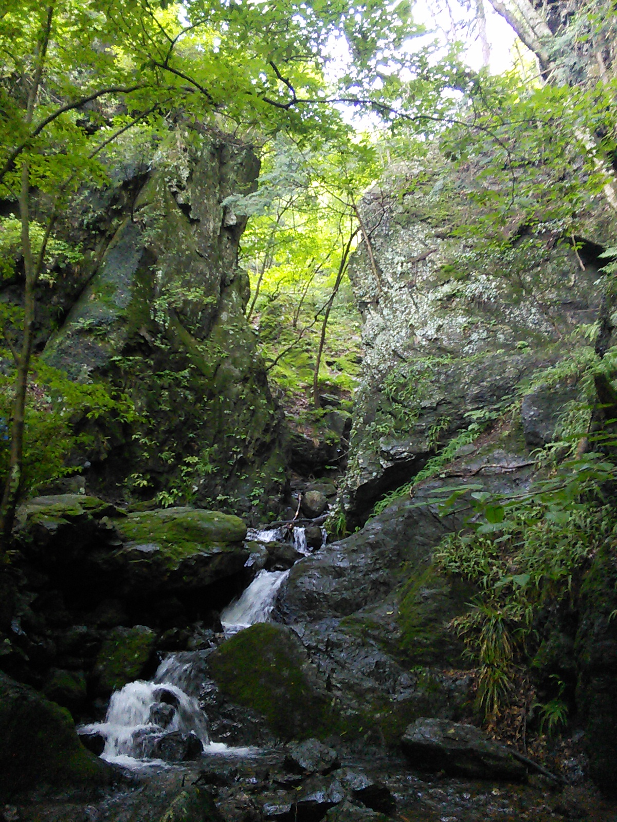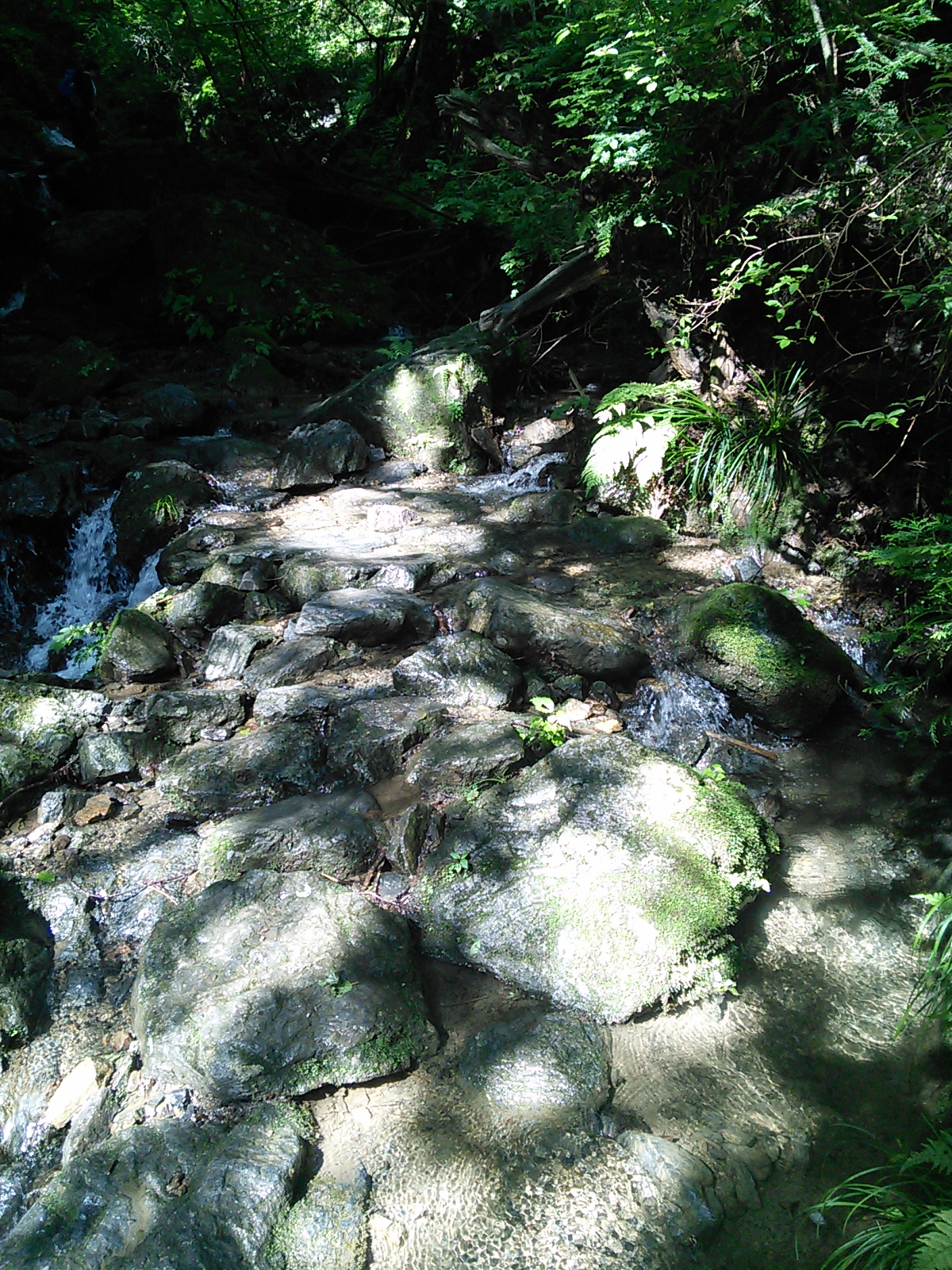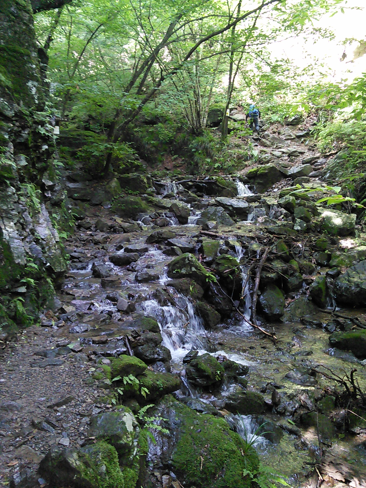 2015年7月25日 棒ノ嶺(白谷沢) 奥武蔵・秩父 2015年07月26日 0 暑そうなので、今回もさっと登ってさっさと下りてくる方式でいきます。棒ノ嶺は今年は三回目ですが、白谷沢コースは今年初めてです。2015年3月25日 高水山・岩茸石山・棒ノ嶺2015年5月30日 川苔山・日向沢ノ峰・棒ノ嶺 有間ダム(名栗湖)の湖畔を通って登山口に向かいます。朝ですが、既に暑い。 登山口からしばらくはこんな感じの道です。杉の人工林だと思いますが、なかなか雰囲気があって悪くないですね。羊歯の下生えに苔むした杉の幹、まるで太古の森を歩いているような、と言ったら大袈裟ですが。 岩の上をナメて水が流れています。このあたりからが一番楽しい箇所です。 沢を何度も徒渉しながら進んでいきます。足を濡らしたくない人は、防水シューズ必須です。沢の上は空気が涼しい! 水と緑が美しい。 この岩の間を通っていきます。 沢の上を歩いて遡っていくような気分。 楽しいコースです。 鎖が付いている箇所もありますが、特別な技術や体力は必要ありません。注意深く進みましょう。 細い流れが滝のようになっています。 楽しかった沢の道とお別れして、林道を横切ります。ここからは結構急な坂道が続きます。しかも暑い。 登山道の真ん中に白い花が咲いていました。オオバギボウシ(大葉擬宝珠)でしょうか。夏に咲く花で、白の他に薄紫の花もあるようです。 頂上に着きました。暑いので頂上でのんびりする気も起きず、一息ついたら下山します。下りもやっぱり暑い。汗をダラダラかきながら歩いていきます。道が濡れていて滑り易くなっているのも疲れます。それでも予定通り午前中に下りてくることができました。前に白谷沢を登ったのは初冬だったのですが、今回の方が水量があってよかった気がします。 [0回]